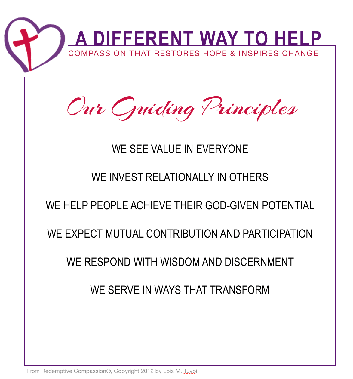 One of my favorite trainings is a workshop called Redemptive Compassion, written by Lois M. Tuypi. Taking the workshop is a wonderful step in learning a different way to help. Here’s what a Love INC volunteer had to say after taking the workshop:
