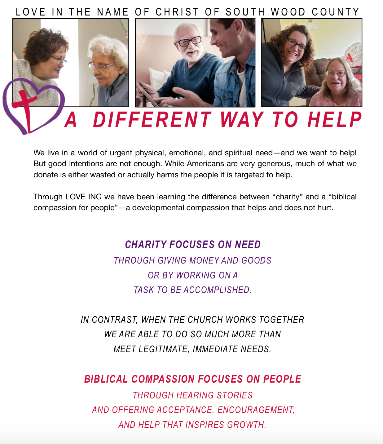 As a volunteer with Love In the Name of Christ of South Wood County, I have been learning so much! My thinking has been challenged, and I’ve realized there are two basic ways to start the “helping process.” One focuses on the NEED, while the other focuses on the PERSON. My mind is slowly grasping the difference between “charity” and “true biblical compassion.”
